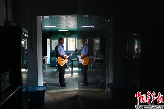 On August 14th, at the bus station of No.387 Road in Beijing Asian Games Village, Wang Bojun practiced his guitar in the staff lounge. China Youth Daily China Youth Network Trainee reporter Kong Siqi/photo